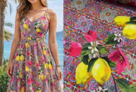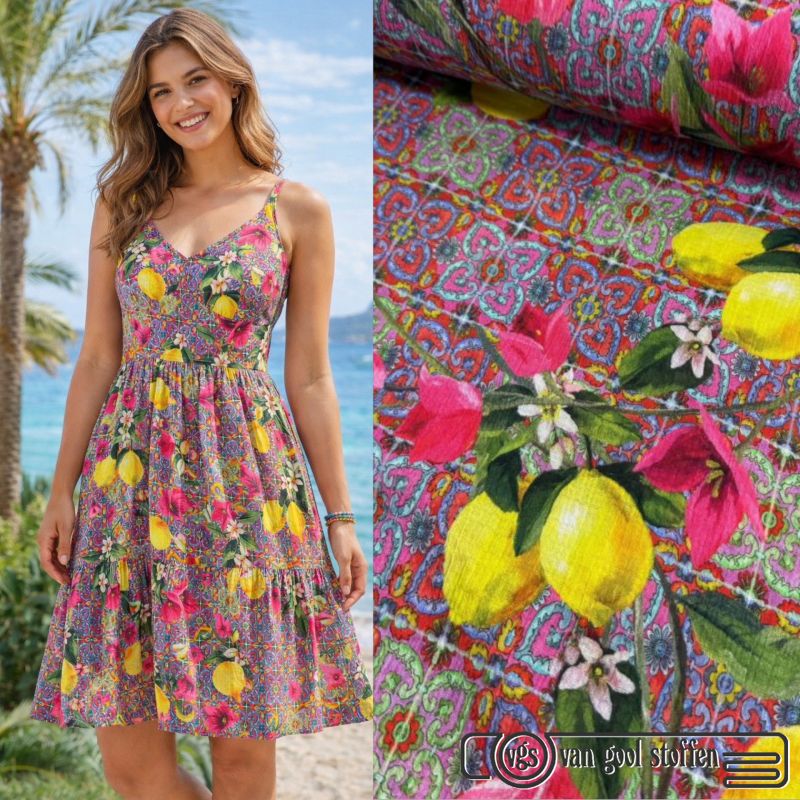 Mouseline /hydrofile viscose exclusieve designer stof fuchsia met bloemen en citroen