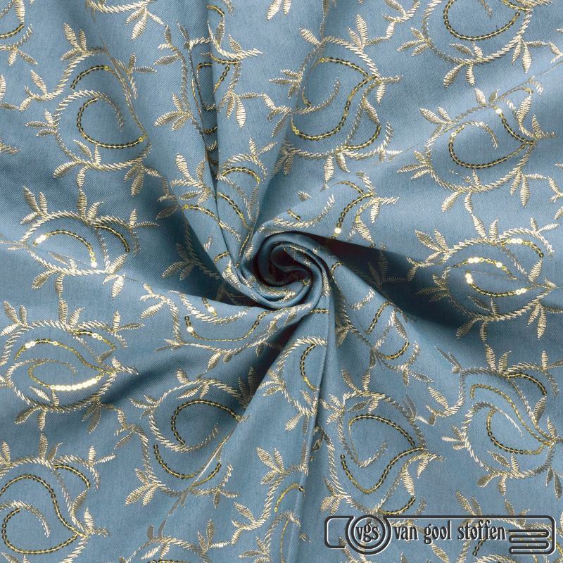 Denim stof met geborduurde bladeren kleur 003 My Image collectie