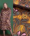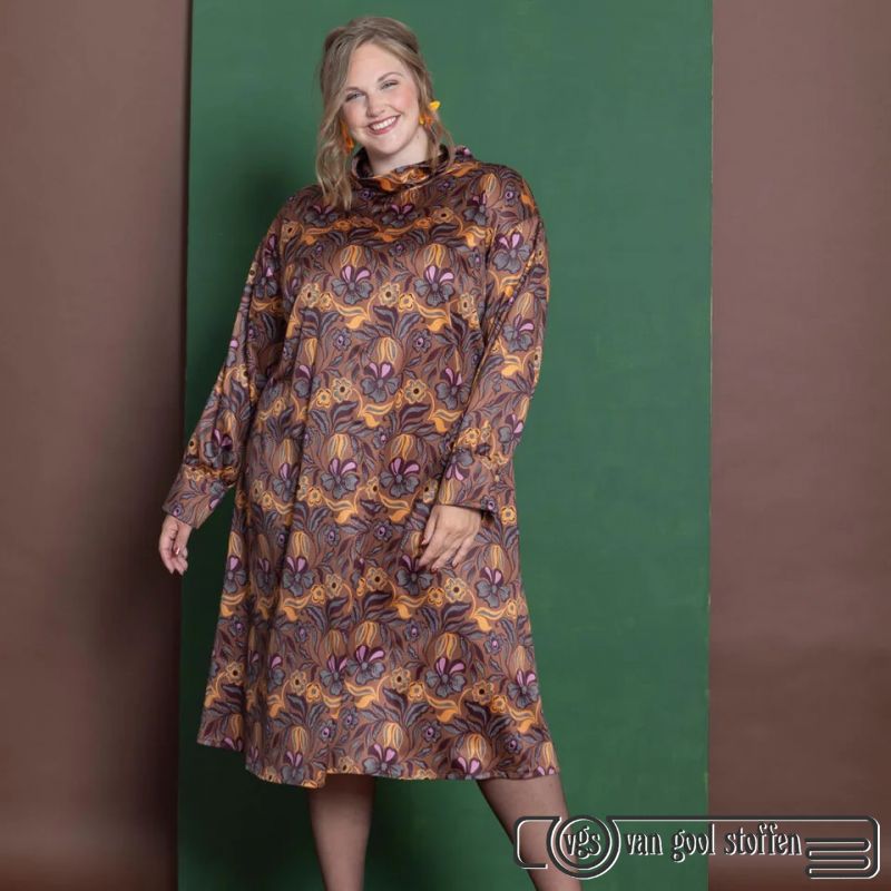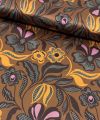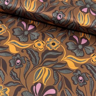 Deze satijn stretch van het exclusieve merk A La Ville heeft een prachtige, subtiele glans en een soepelvallende kwaliteit. De stof is uitgevoerd in een warme caramelbruine tint met een verfijnd bloemenmotief — perfect voor stijlvolle en vrouwelijke creaties.