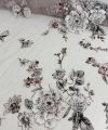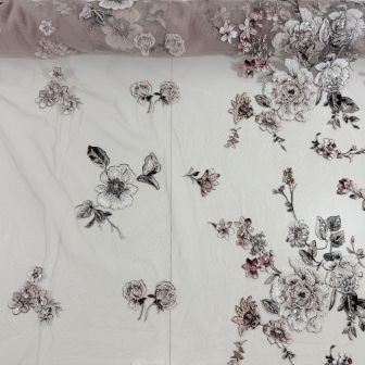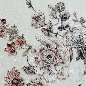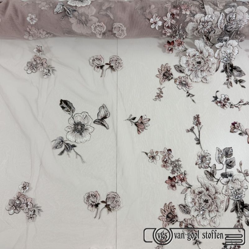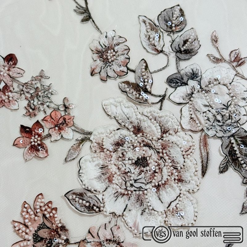 Dentelle haute couture exclusive sur tissu de base en tulle extensible couleur peau. La dentelle mesure 120 cm de large.