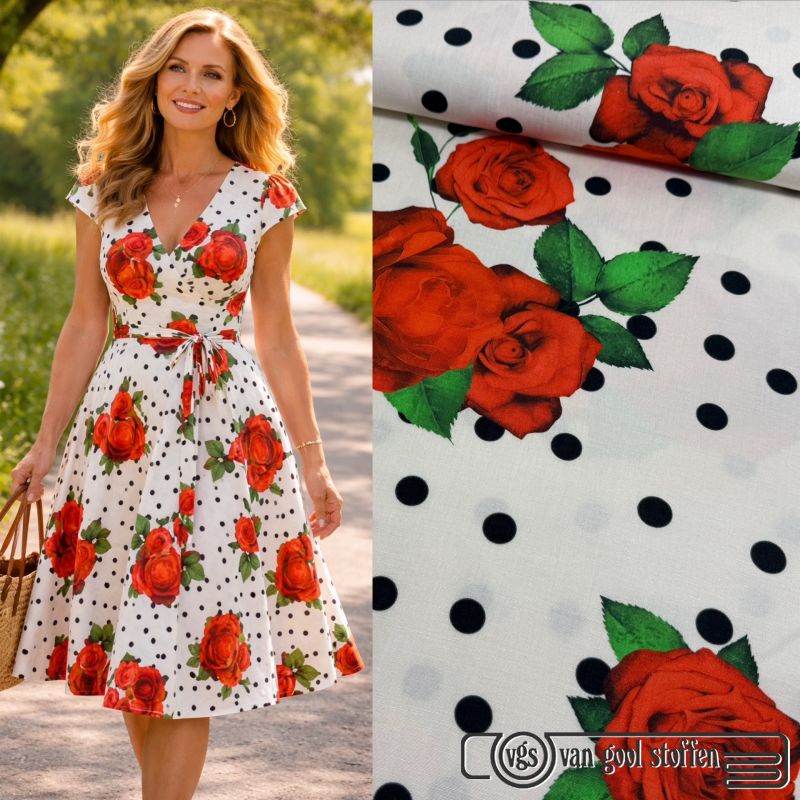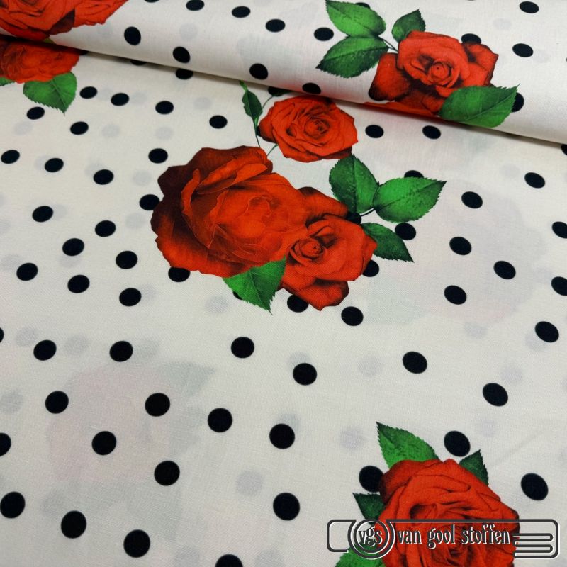 Linnen viscose polka dots met rozen exclusieve designer stof