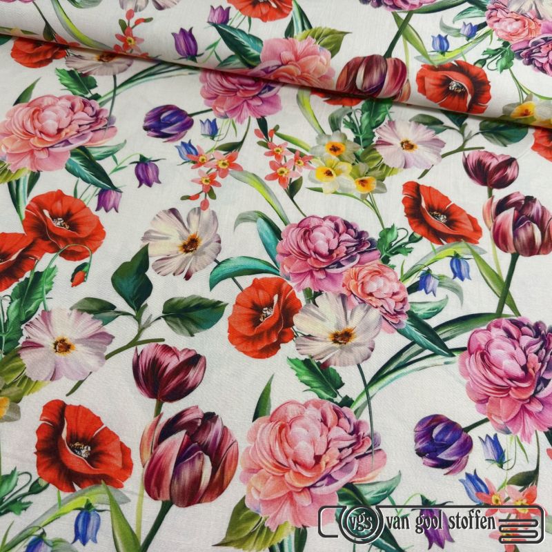 Viscose crepe bloemen ivoor rood ecovero exclusieve italiaanse designer stof