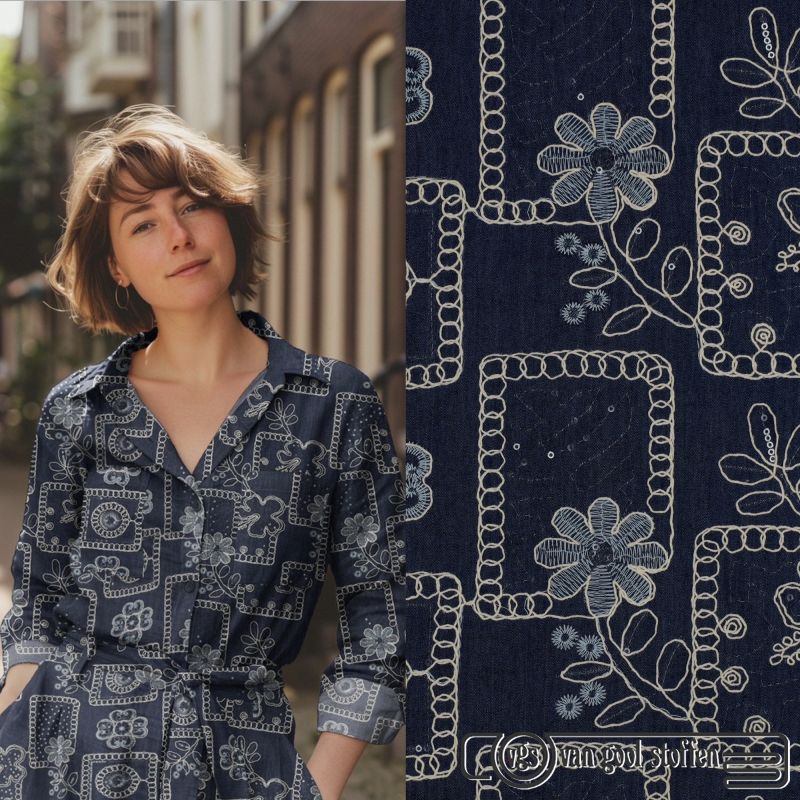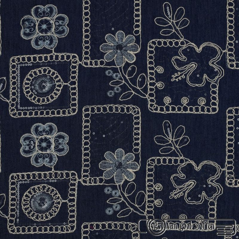 Denim stof met geborduurde bladeren kleur 006 My Image collectie