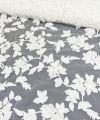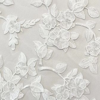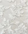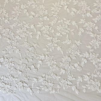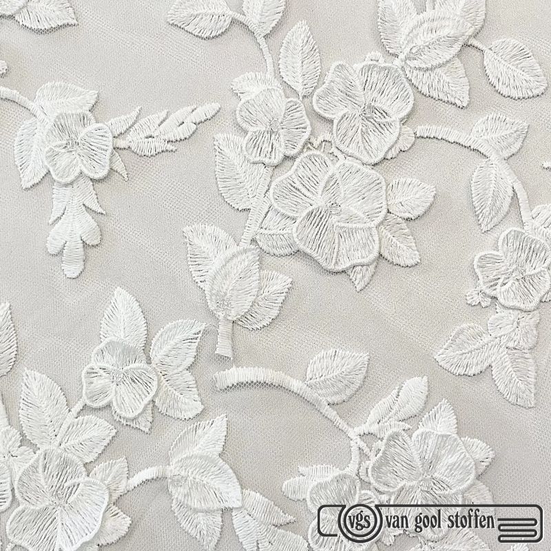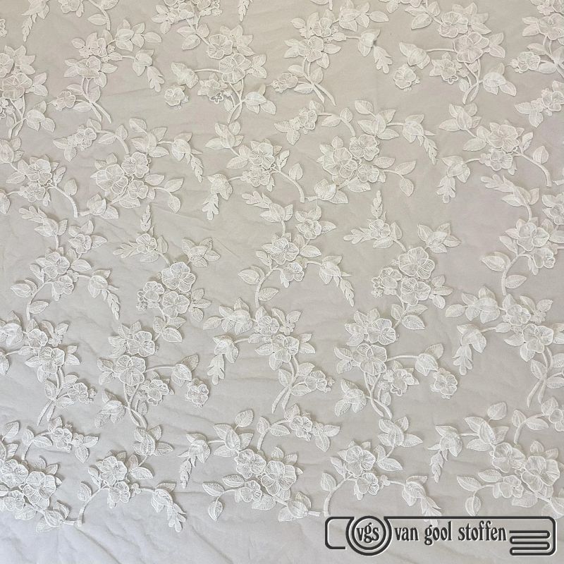 De stof is uitgevoerd op een fijne tule basis en afgewerkt met subtiele ivory kraaltjes die met zorg zijn aangebracht op de 3D bloementjes. Dit zorgt voor een elegante glinstering en extra diepte in het dessin.