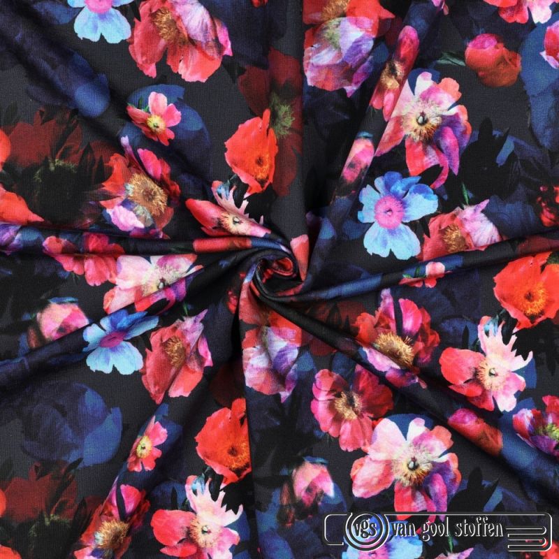 French terry digital flowers donker blauw