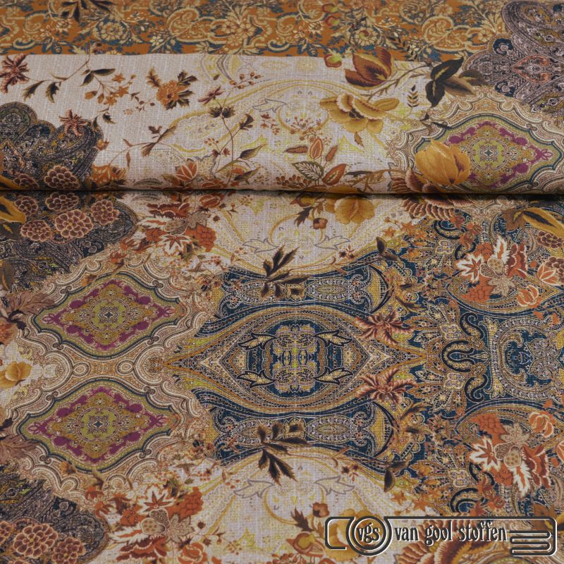 Exclusieve zijde stretch Italiaans design paisley oker bruin