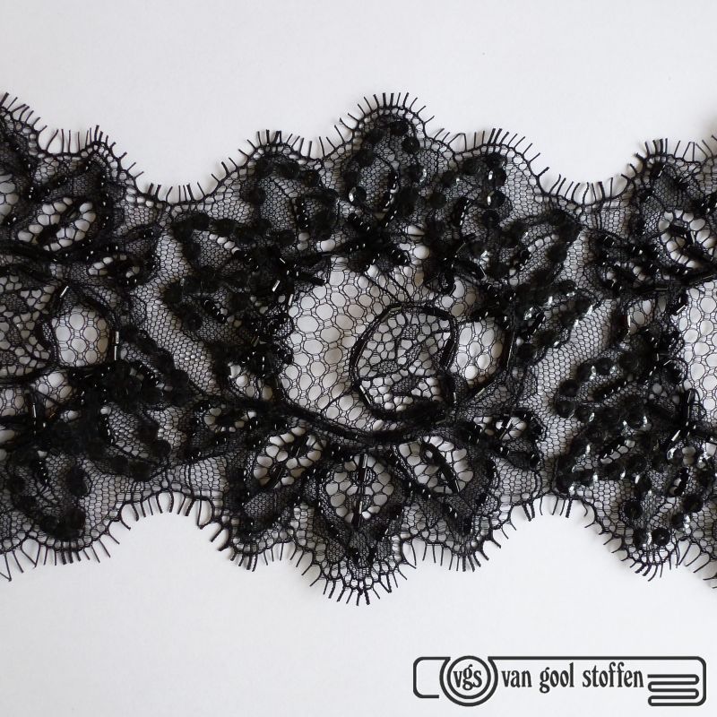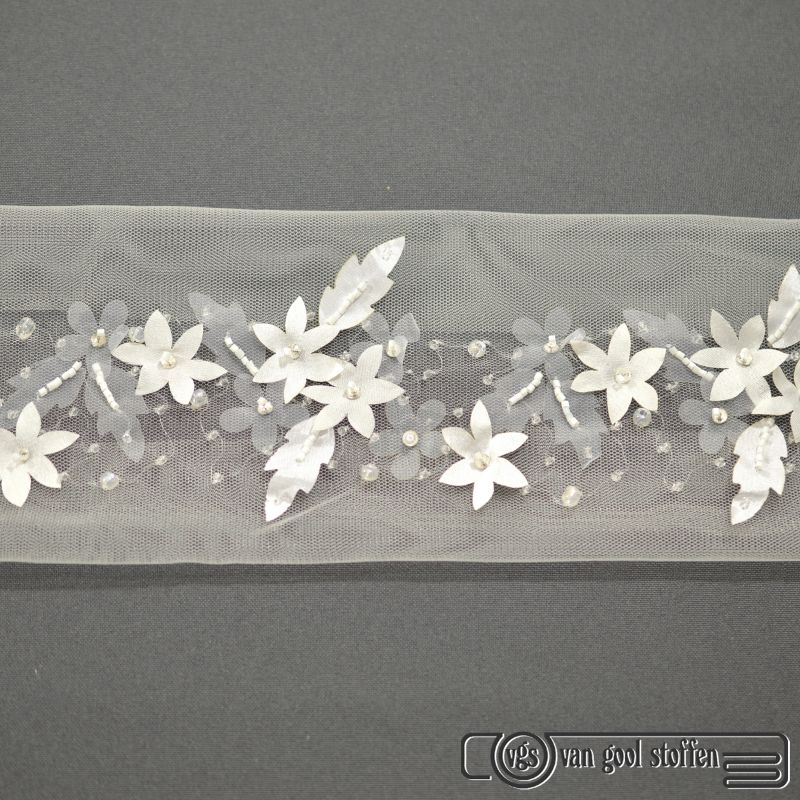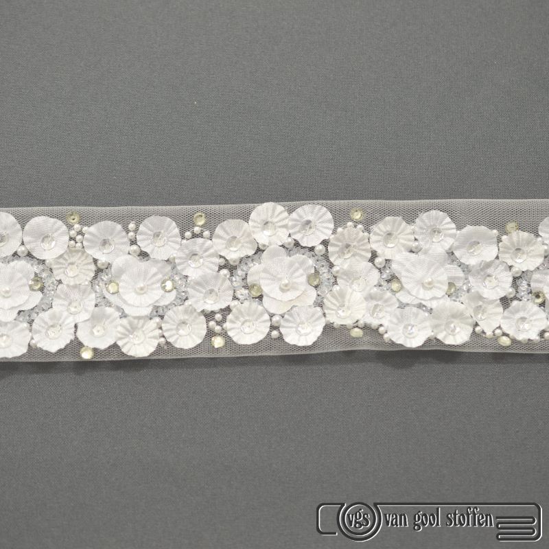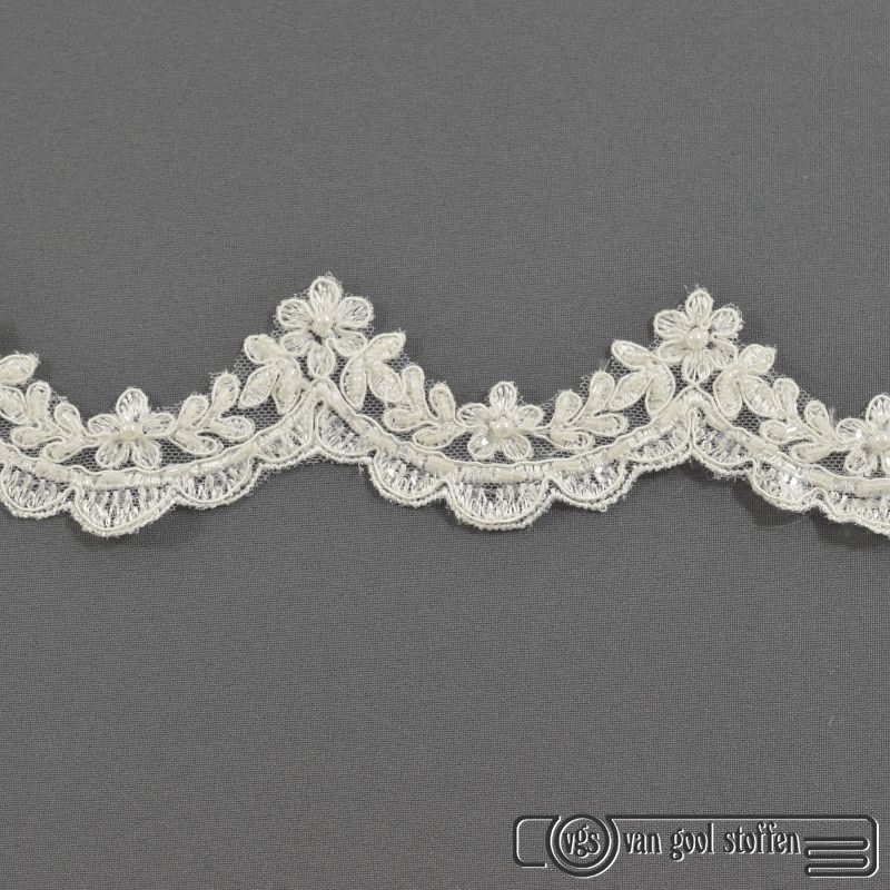 Kanten rand met parels en bloem pailletten 2cm ivory