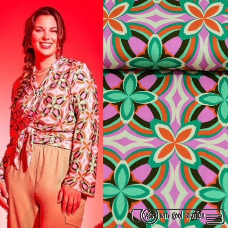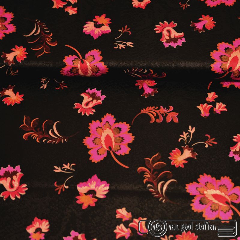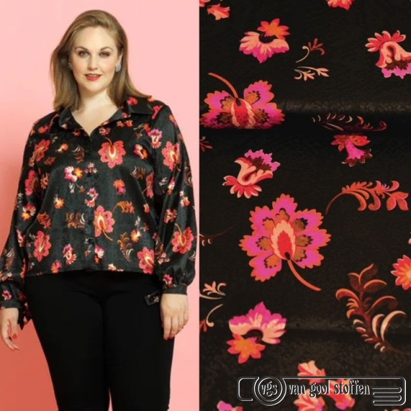Stretch satijn zwart fuchsia bloemen A la Ville #knipmode