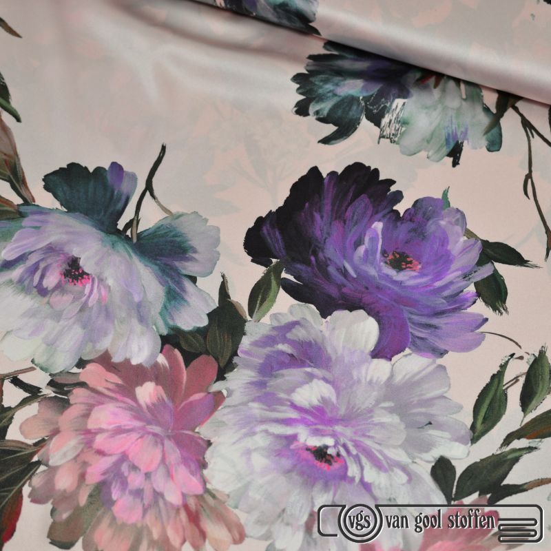 Exclusieve stretch zijde Italiaans designer bloemen print poeder rose
