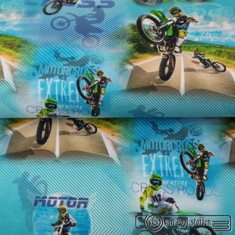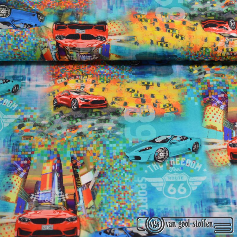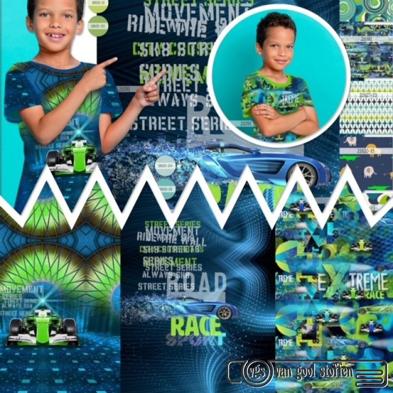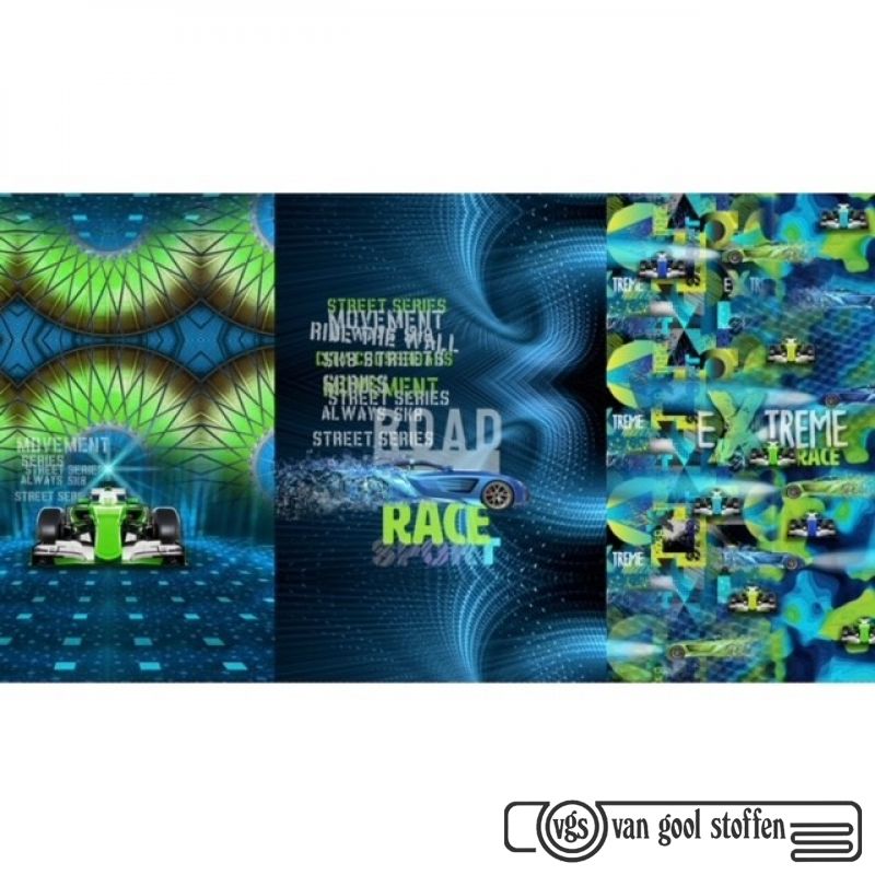 Panel tricot katoen race auto 3 luik 75cm x 150cm breed. groen blauw