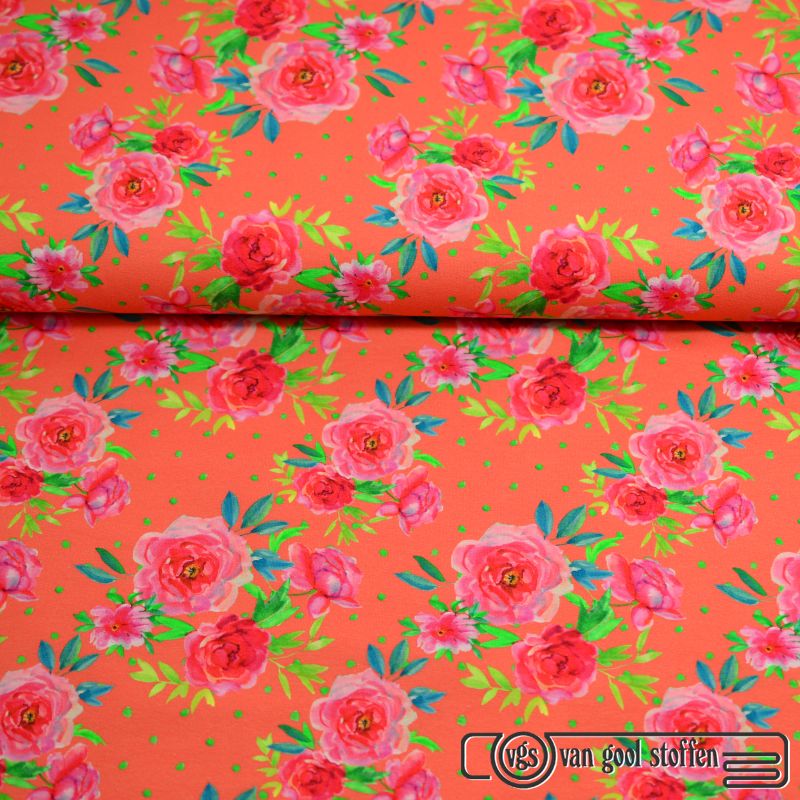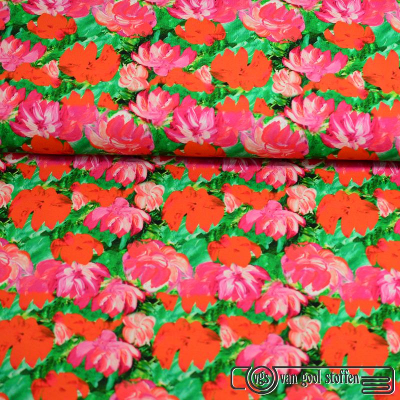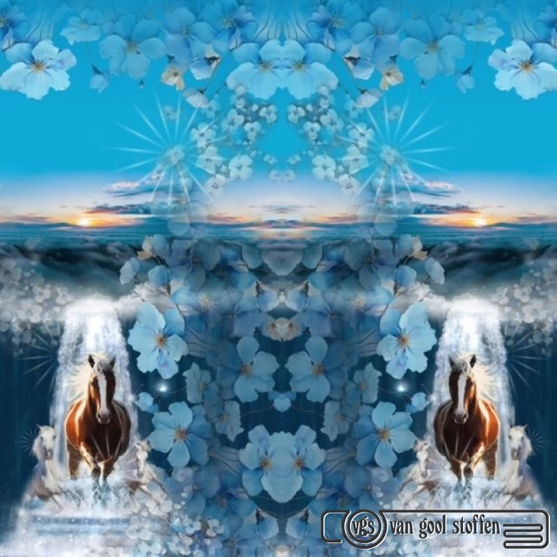 Panel tricot katoen paard met bloemen blauw 120cm x 150cm breed.
