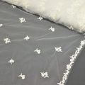 Haute-Couture-Tüll mit Spitzenbasis, verziert mit Pailletten, Perlen und einem dezenten Silberfaden. Eine Seite breite Wellenkante, die andere Seite schmale, fertige Wellenkante. Höhe Rand +/- 23 cm.