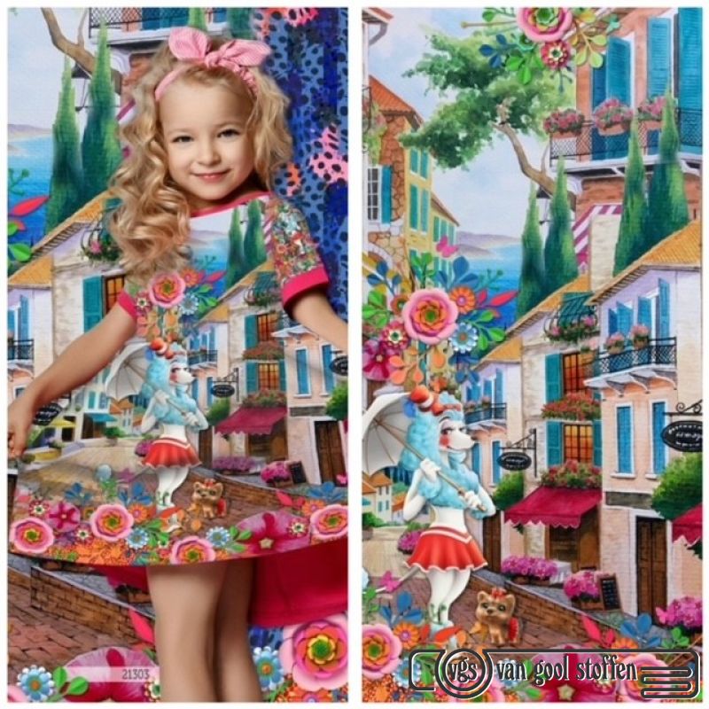 95% Baumwolle 5% Elasthan 150 cm breit 250 Gramm m2 digital bedruckt. Kann für Pullover, Kleider, Hosen und T-Shirts verwendet werden.Öko-Tex zertifiziert.