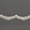 Haute Couture 3D-Spitze grau. Der Grundstoff ist grauer Tüll, der mit Blumenperlen und Perlen verziert ist. Die Blumen werden sehr exklusiv verarbeitet. die spitze hat ein bortenmuster, so dass die seite eine breite gewellte kante hat und in einer schmalen gewellten kante endet (siehe foto).