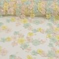 Haute-Couture-Spitze mit Blumen verziert mit Pailletten, Perlen und Perlen. Diese exklusive Spitze hat einen nudefarbenen Tüll als Basis und die Blüten sind rosa, mint und hellgelb. Diese Seite hat eine fertige Wellenkante.