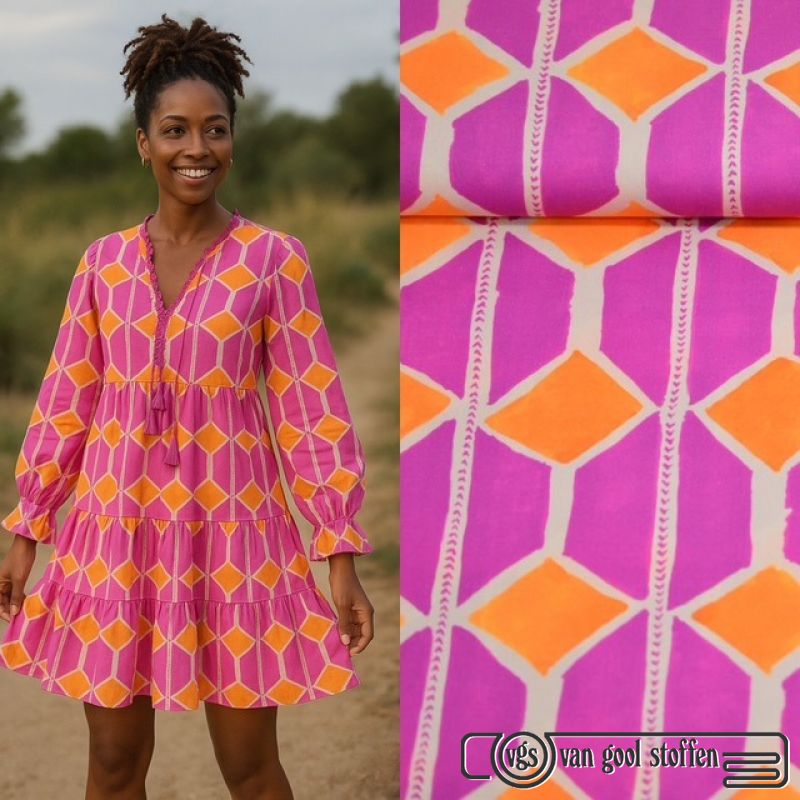 Großes Druckmuster, Höhe 95 cm. 100 % Mikropolyester, 100 g/m², 140 cm breit. Dieser Stoff eignet sich für Blusen, Kleider und Röcke.