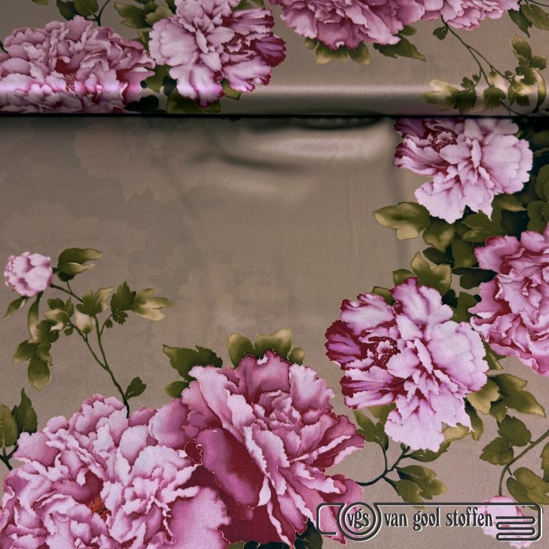 Exclusieve stretch zijde Italiaans design bloemen print taupe cerise