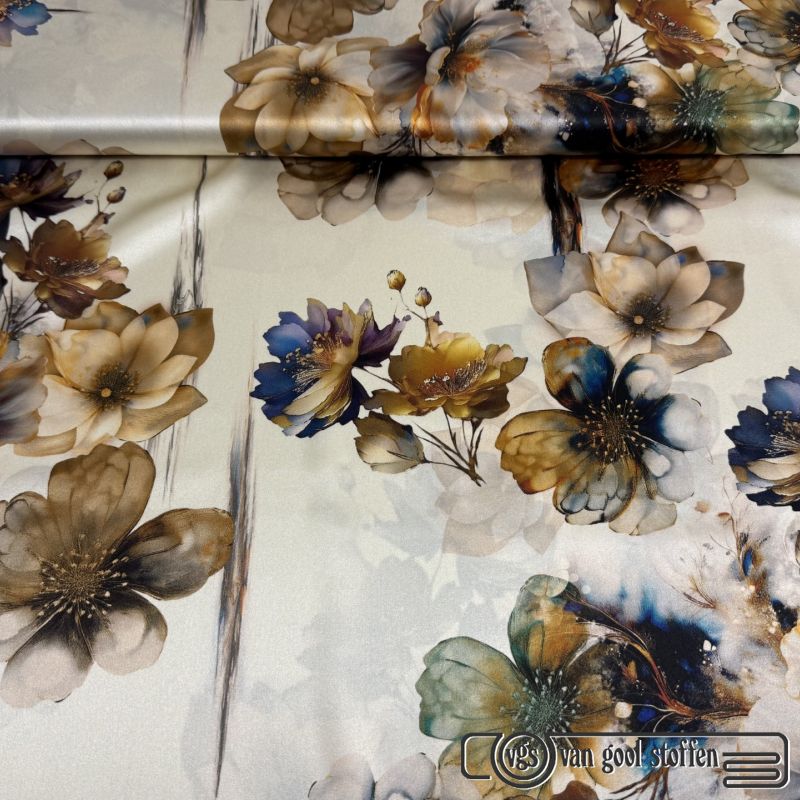 Exclusieve stretch zijde Italiaans design bloemen print camel creme
