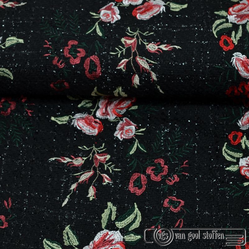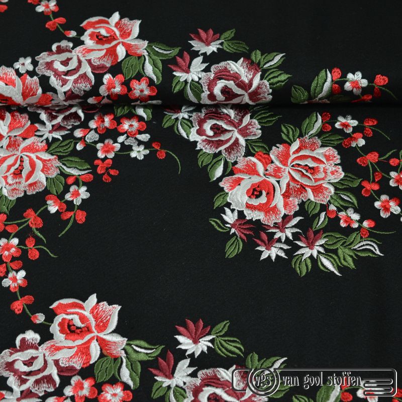 Exclusieve geborduurde grof geweven mantelpakjes stofzwart met rozen