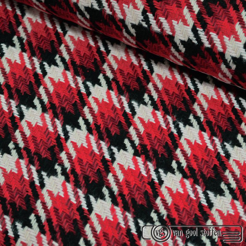 Exclusieve grof geweven mantelpak stof italiaans design ruit rood zwart