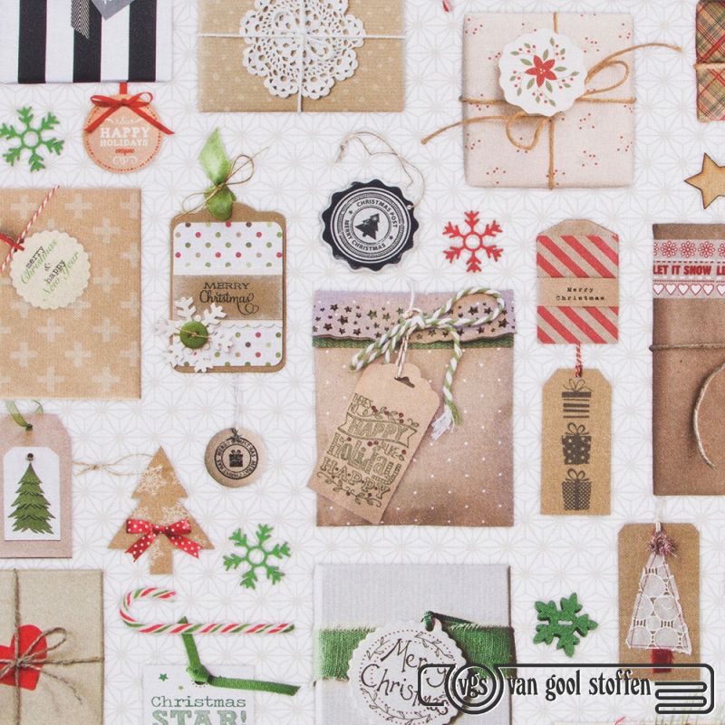 Katoen poplin kerst stof slinger motief met goud folie ivory