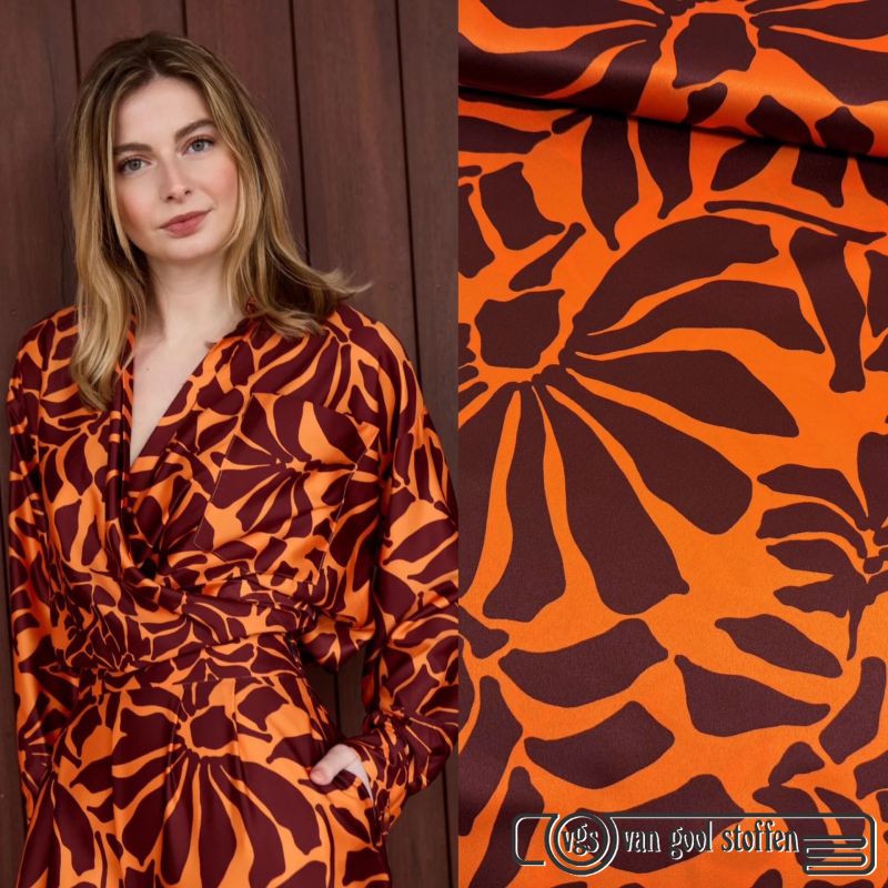 Stretch satijn bloemen print oranje burgundy A la Ville / knipmode