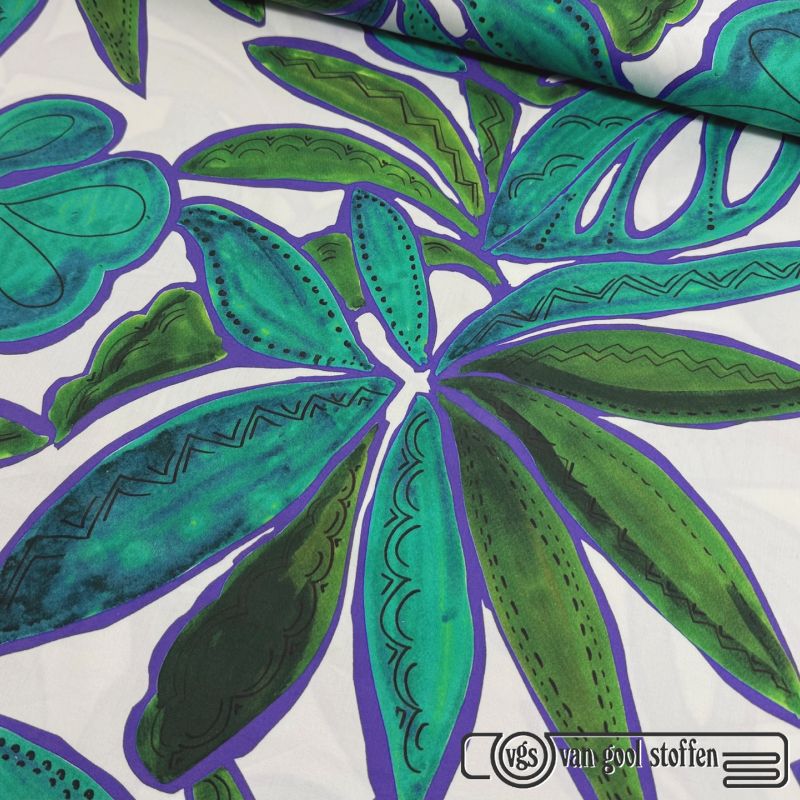 Exclusieve stretch katoen leaves print groen paars