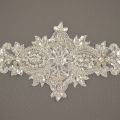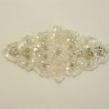 Bruidsapplicatie met strass steentjes, kraaltjes en band. Deze applicatie is 16cm breed en 8,5cm hoog.