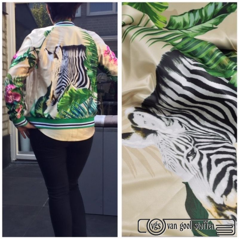 Exclusieve italiaanse micro silky satijn stretch. Deze exclusieve Italiaanse satijn heeft de touch en uitstraling van een zijde satijn. 97%polyester 3%ea 150cm breed 145gram m2. Deze stof gaat per panel en dient u per stuk te bestellen . De panel is +/- 0.70 cm x 140 cm. De giraffe staat dwars op de stof dus wij adviseren om deze andersom te gebruiken, lengte van de stof voor de breedte!! De giraffe is ongeveer 35cm hoog.