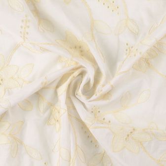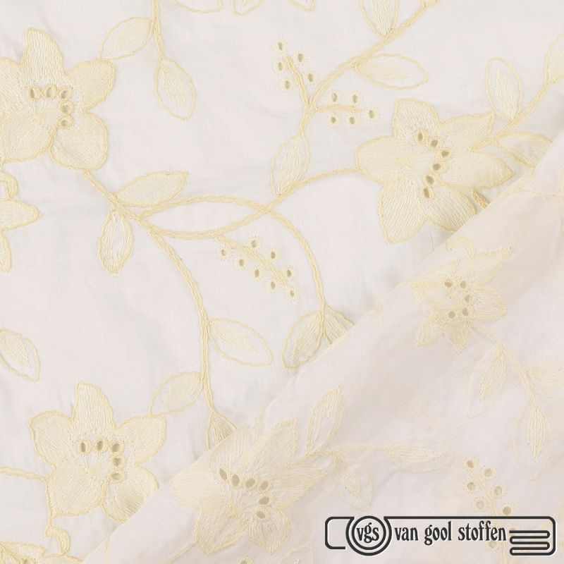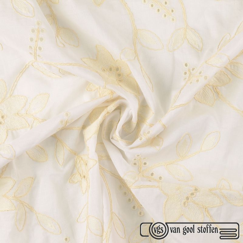 Deze prachtige witte katoen stof is voorzien van een verfijnde bloemen borduring en heeft een elegante, romantische uitstraling. Dankzij de stevige maar comfortabele kwaliteit is de stof perfect geschikt voor diverse kledingstukken.