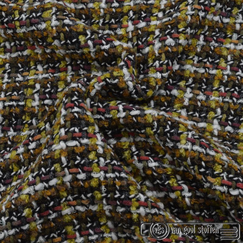 40% wol 30%polyester 30%viscose pied du poule ruit. Deze ruit heeft een subtiele ingeweven metallic draad waardoor je een lichte schittering krijgt.