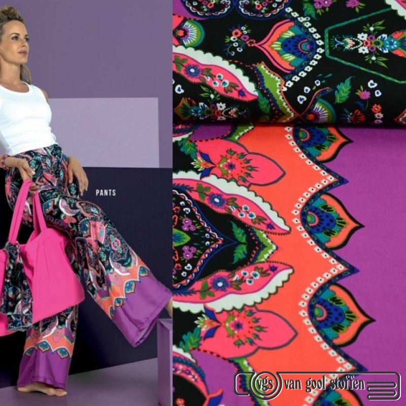 100%ecovero viscose voile 80 gram 140cm breed. soepel vallende stof doorschijnende te gebruiken voor blouse , jurken , rokken. Deze stof is een rand patroon met aan een kant van de stof een kerrie kleur balk. Deze stof is een panel van 1.50x1.40. deze stof is mooi te combineren met de viscose travel.